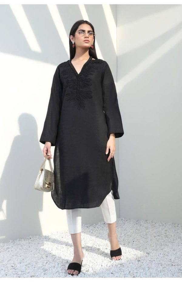 A dreamy black slub kurta with glistening 3d embroidered flowers with round neckline and button details