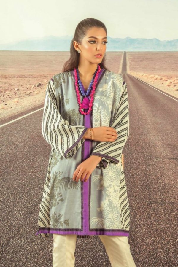 An ash grey base is printed with a modern impression of mesmerizing tropical bushes combined with muted traditional stripes. The final touch of vibrancy comes from the accented solid purple border.