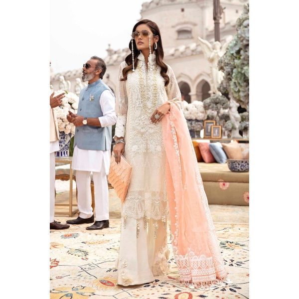 Dreams etched in soft cream palettes. Geometric patterns and floral ethnic designs glisten over this cream woven net base. Bringing the entire ensemble together is the regal salmon pink organza puff paste dupatta along with matching cream pants and a cream slip in cotton. A luxurious lawn ensemble sure to brighten up any occasion.