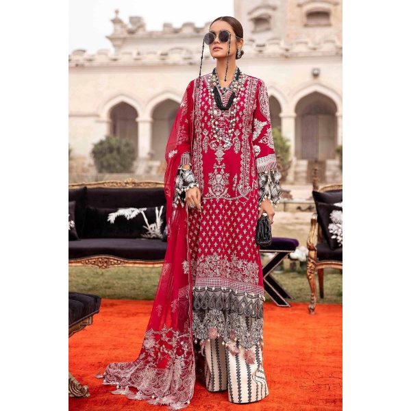 Are you ready for a bold fixation of colour? This ensemble ties together reds, blacks and whites with mesmerizing South Asian style embroideries. A deep red robby base is layered with resham embroideries. The sleeves and back are printed with monochrome flora and intricate geometric style patterns. Paired with a sumptuous tulle net embroidered dupatta and rotary printed monochrome cotton pants.