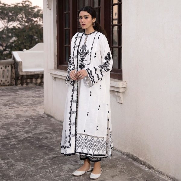 n classic monochrome ‘Shatranj’ features a long and relaxed silhouette beautifully embroidered with ornamental ebony silk threadwork on a pristine ivory base. Paired with an embroidered dupatta, this elegant ensemble will see you through the season in style.